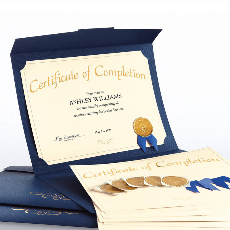 The Achievement Certificate Paper Bundle comes with all the supplies to create 50 complete award certificates and saves you a bundle over ordering items separately! The bundle includes our Certificate of Achievement gold-foil certificates, coordinating presentation folders, embossed gold foil seals, and award ribbons.